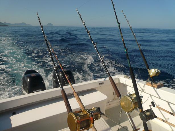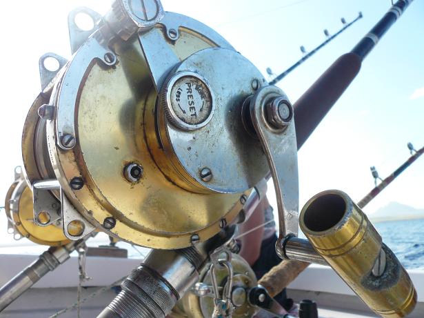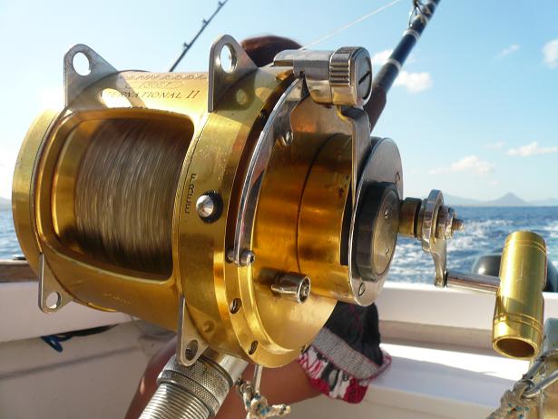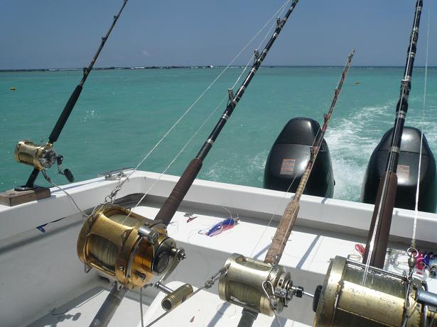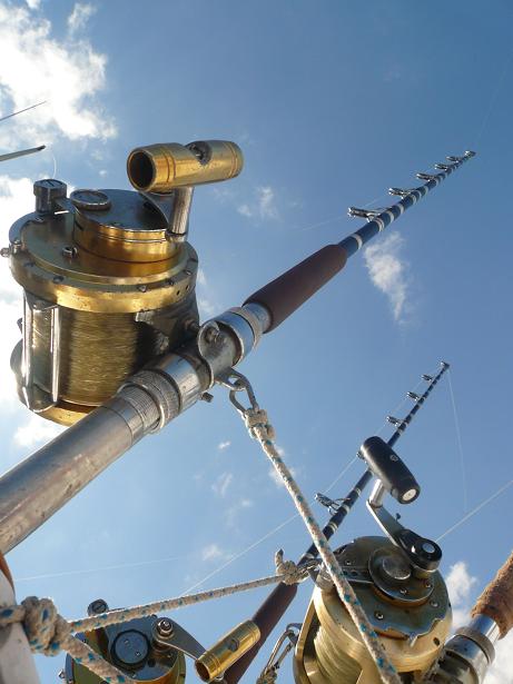 A notre disposition, 7 cannes spéciales pays exotiques: 3 au siège de combat, 2 sur chaque extérieur avant et 2 sur chaque extérieur arrière. Des cannes Shimano et PENN équipées de moulinets trolling PENN REELS en gamme International.